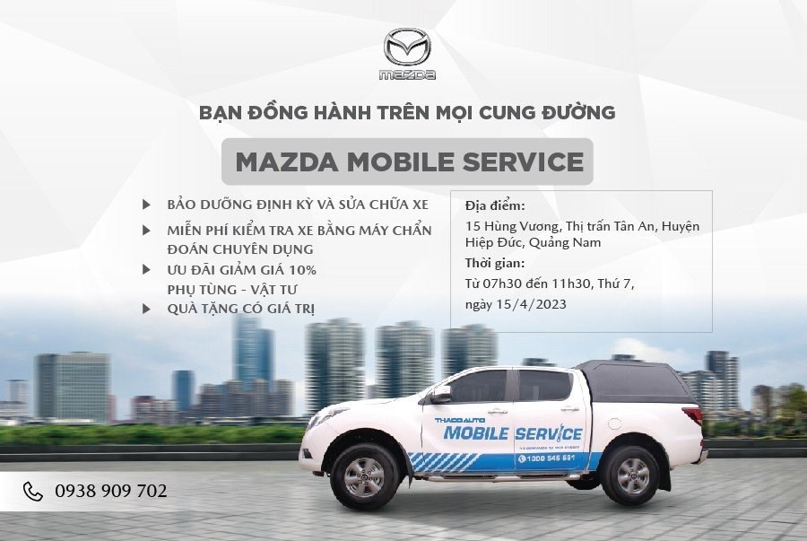 Nhằm hỗ trợ Quý khách hàng ở xa, mang dịch vụ Mazda chính hãng đến gần hơn với Quý Khách hàng, Mazda Quảng Nam tổ chức chương trình bảo dưỡng và chăm sóc khách hàng lưu động - Mobile Service - tại Huyện Hiệp Đức ngày 15/4/2023. Trân trọng kính mời Quý Khách hàng tham dự chương trình.
